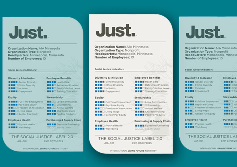 AIA Minnesota has been a proud participant in the International Living Future Institute’s (ILFI) Just program. Although our official Just label has recently expired, our commitment to the values and framework it represents remains strong. The Just program is a valuable, voluntary disclosure tool for organizations to elevate internal discussions, policies, and procedures and create a common language and measurement framework for social justice issues. Just is a call to action, and AIA Minnesota continues its work to be a transparent, equitable, and socially just organization. Learn more and view AIA Minnesota’s past Just label details.