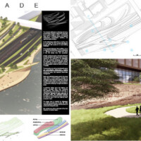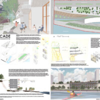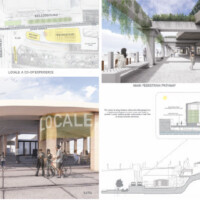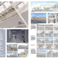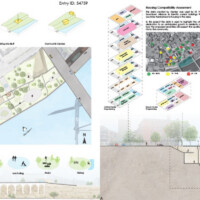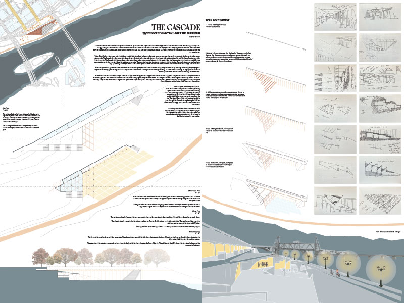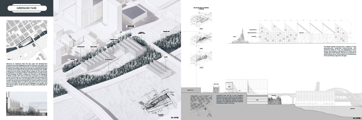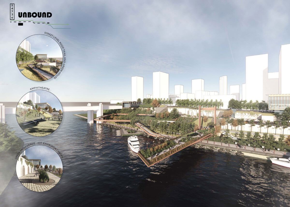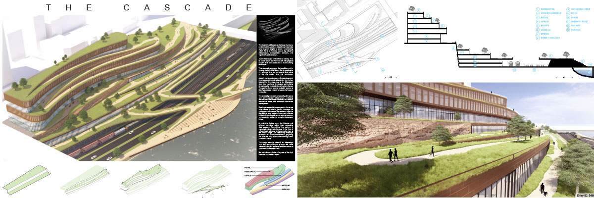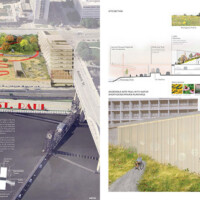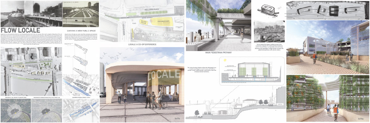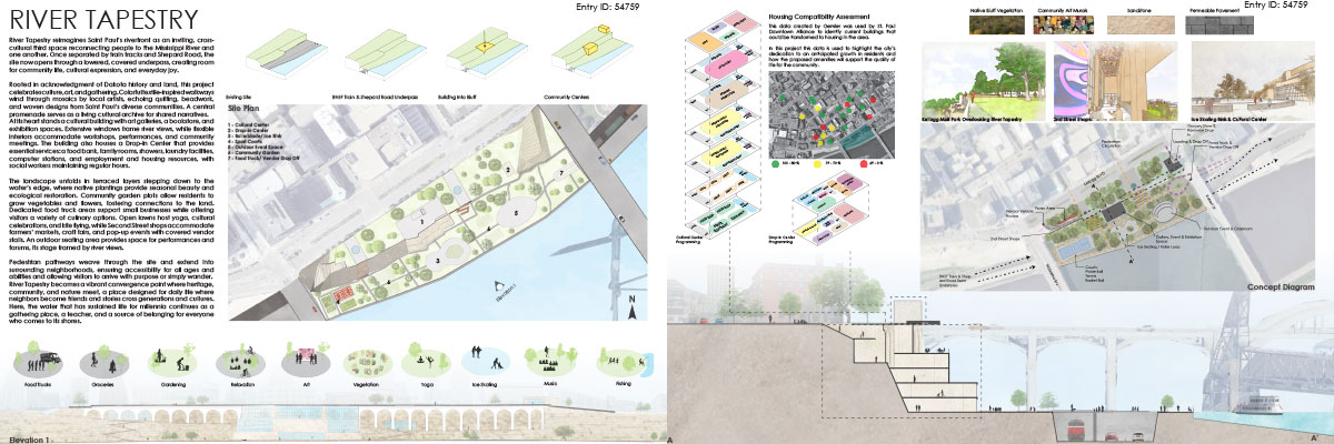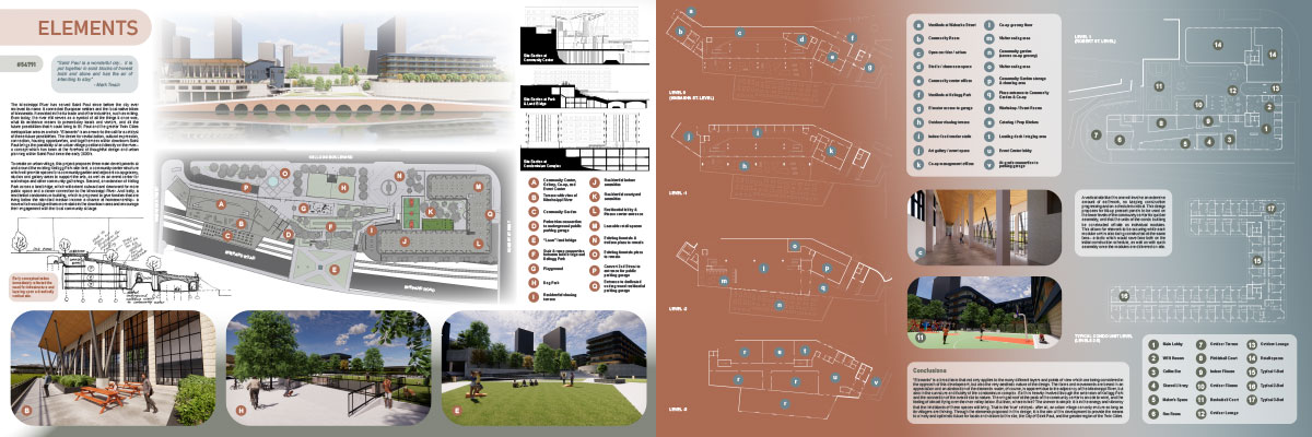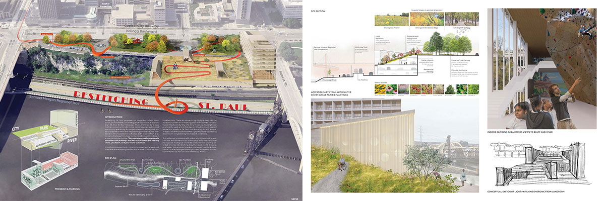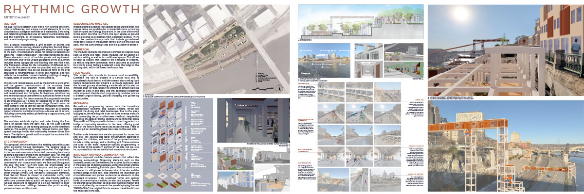 JURY COMMENTS: The analysis of site context and the issues identified in the prompt is methodical and well-reasoned, effectively leveraging local precedents to inform both needs and potential solutions. The proposal establishes a strong connection to Downtown through visual and pedestrian extensions of Minnesota Street and Cedar Street. Adaptive reuse of the existing structures along Kellogg Boulevard into mixed-use towers thoughtfully embraces underutilized infrastructure to provide housing and community amenities. From a master planning perspective, the proposal successfully addresses the prompt and promotes a level of vibrancy not achieved by the other submissions. While the design and imagery are compelling, they may be somewhat overly ambitious; greater restraint could yield improved aesthetic consistency.