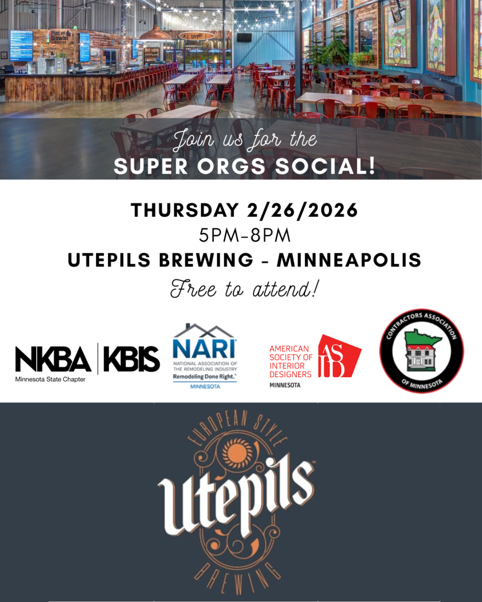 Join AIA Minnesota, NARI Minnesota, NKBA, KBIS, ASID, and CAM for the “Super Orgs Social” at Utepils to connect with peers across the industry on Thursday, February 26! Free to attend.