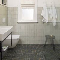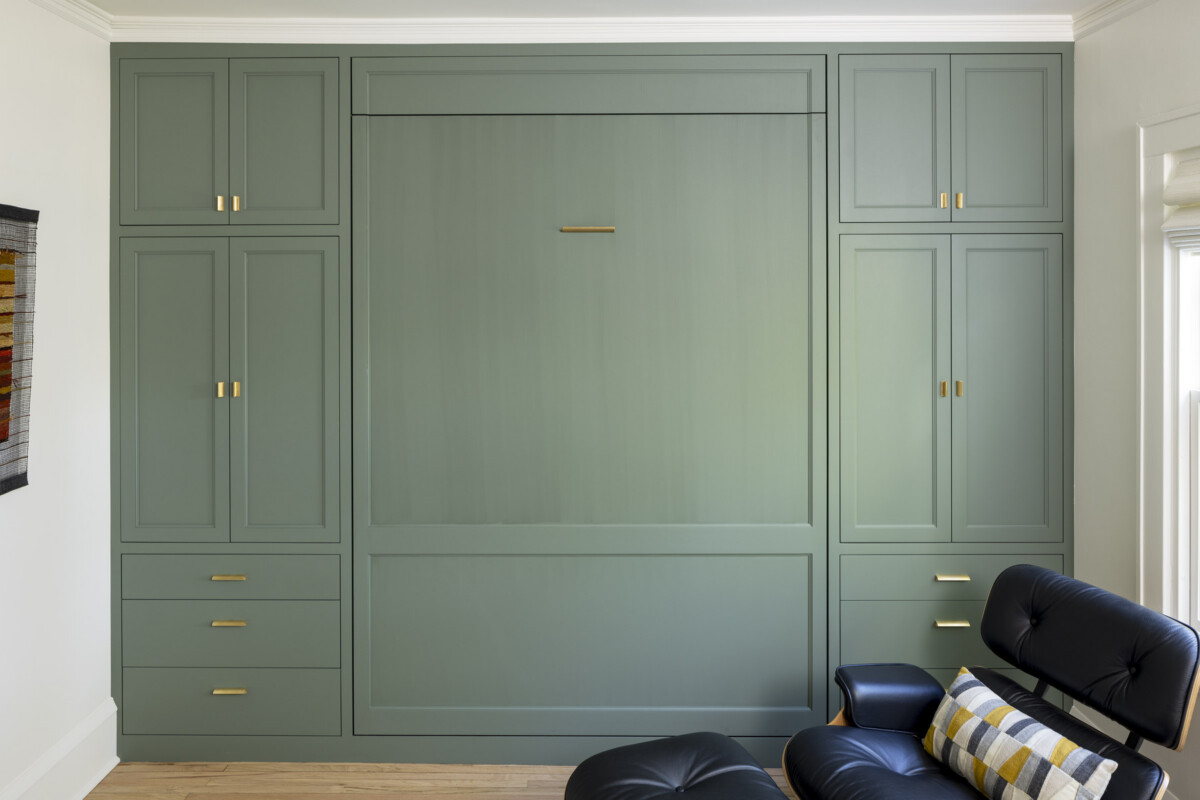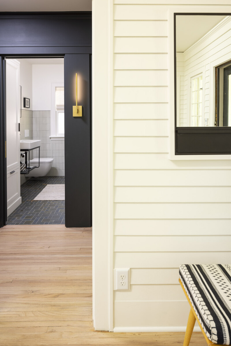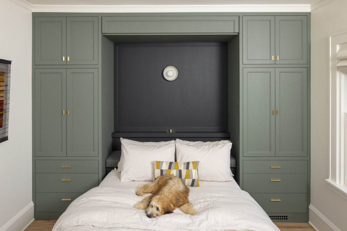 To address the bathroom, the rotting window and old tub were removed. The window was replaced with an insulated, frosted-glass unit that matched the original divided-lites, improving both daylight and privacy. A large walk-in shower was rotated away from the window by reclaiming an inefficient guest room closet. A wall-mounted toilet and relocated linen cabinet maximized space. The sacrificed guest closet became a full wall of custom cabinetry with a Murphy bed and flexible workspace. The primary bedroom got a paneled headboard wall and new full-height wardrobe, doubling storage. Initially not part of the plan, a failing roof-to-wall connection demanded attention. Removing the flat ceiling allowed for new rafters, ties, and a vaulted ceiling with a skylight— adding cost, but delivering daily light and long-term resilience.