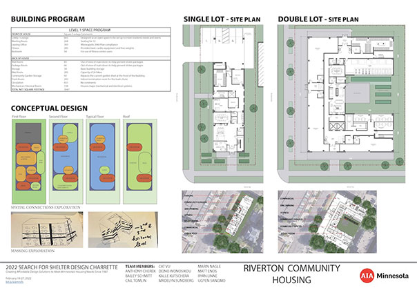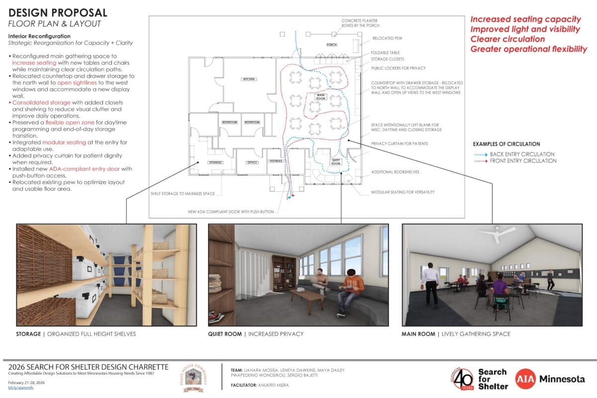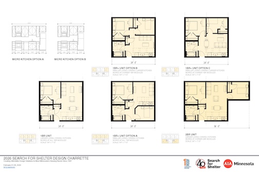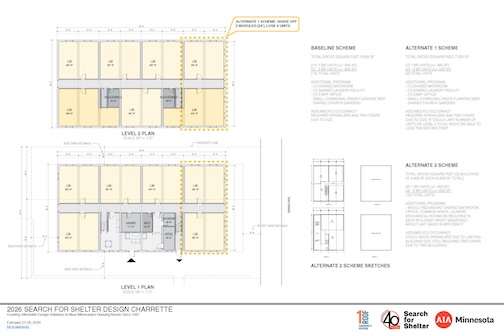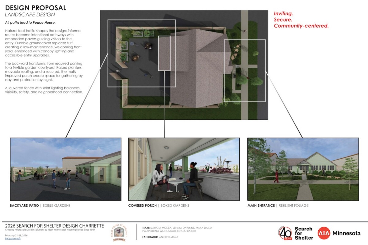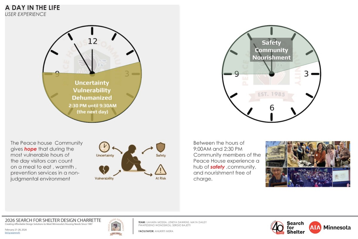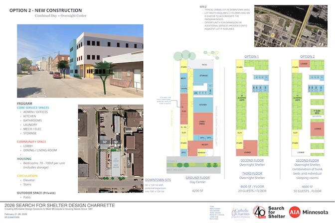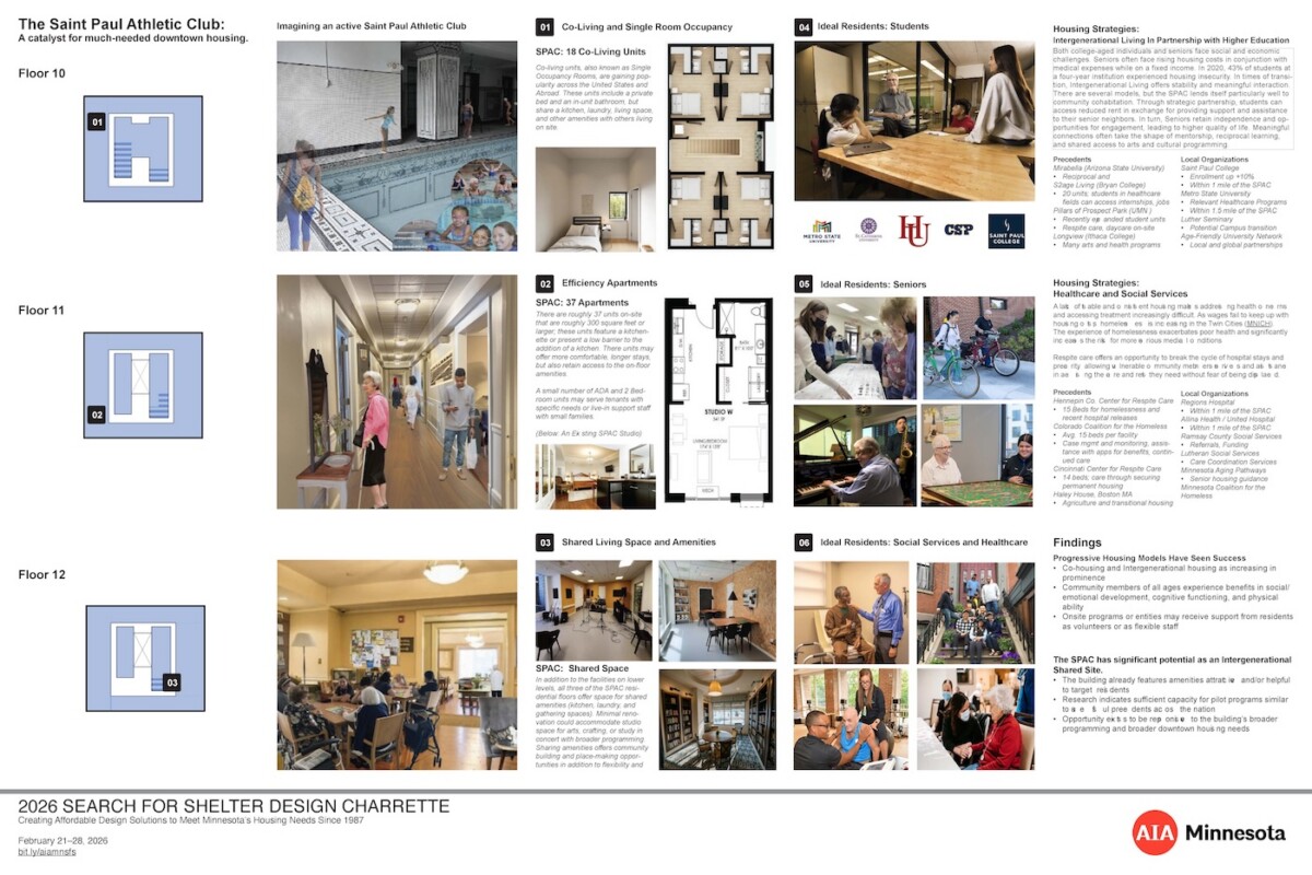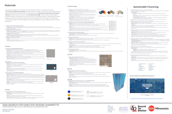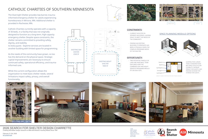Thank you to the five agencies who worked with our volunteers at the 2026 Search for Shelter design event. View their final boards in the adjacent gallery. 2026 agencies: Agate Housing, Catholic Charities of Southern Minnesota, One Roof Community Housing, Peace House, and the St. Paul Athletic Club with the Minnesota Design Center.